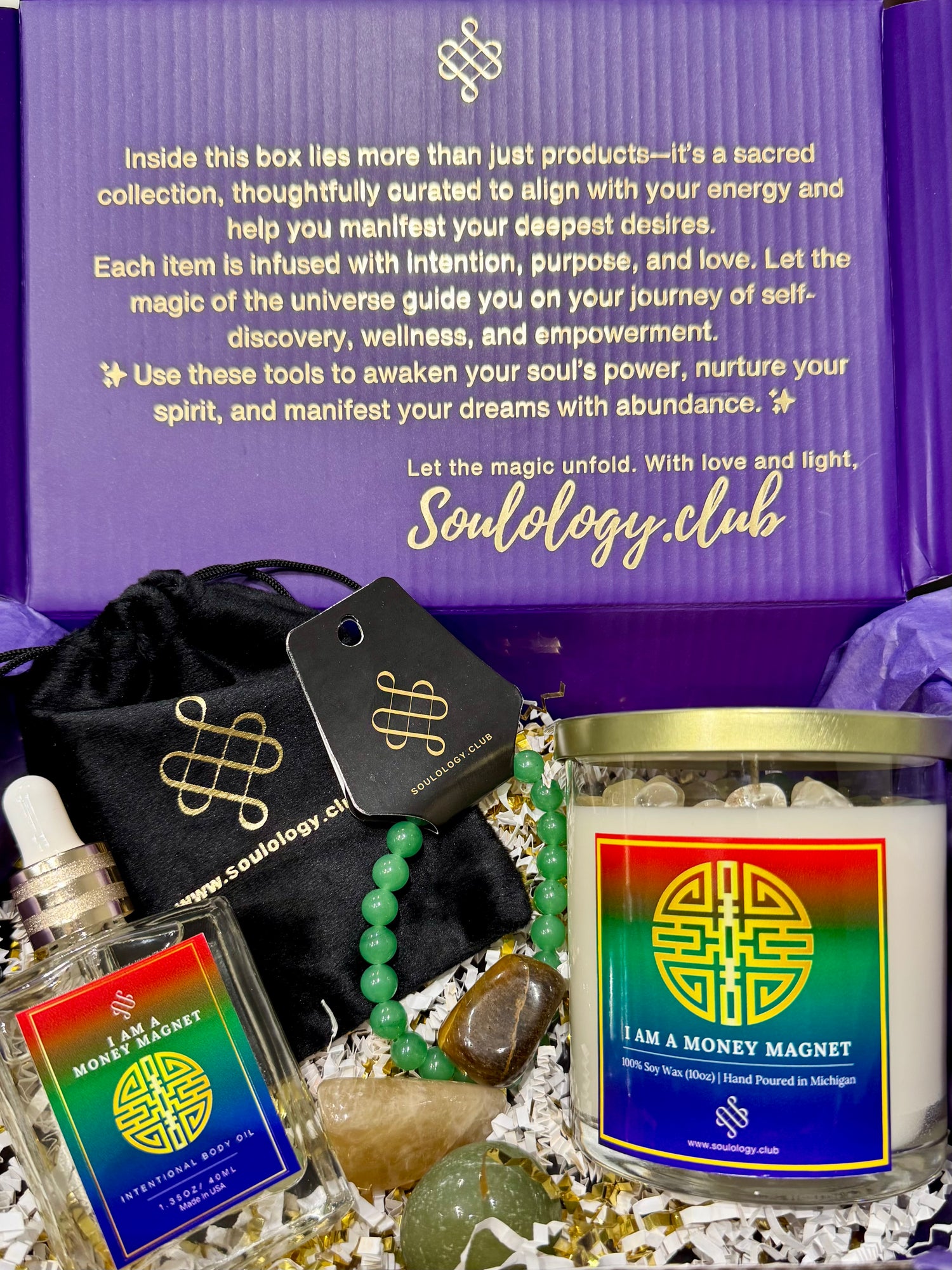 💸 Money Magnet Body Oil – A luxurious, crystal-infused body oil blended with powerful money-drawing essential oils and green aventurine. Apply daily to align yourself with abundance energy and attract financial blessings.